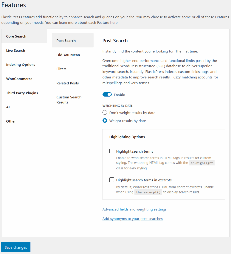 You know we’ve been working on our Features page. After a good set of improvements made in ElasticPress 5.0, ElasticPress 5.3 now groups features together and improves the overall experience, with field dependency, conditional display, and dedicated URLs for each feature.